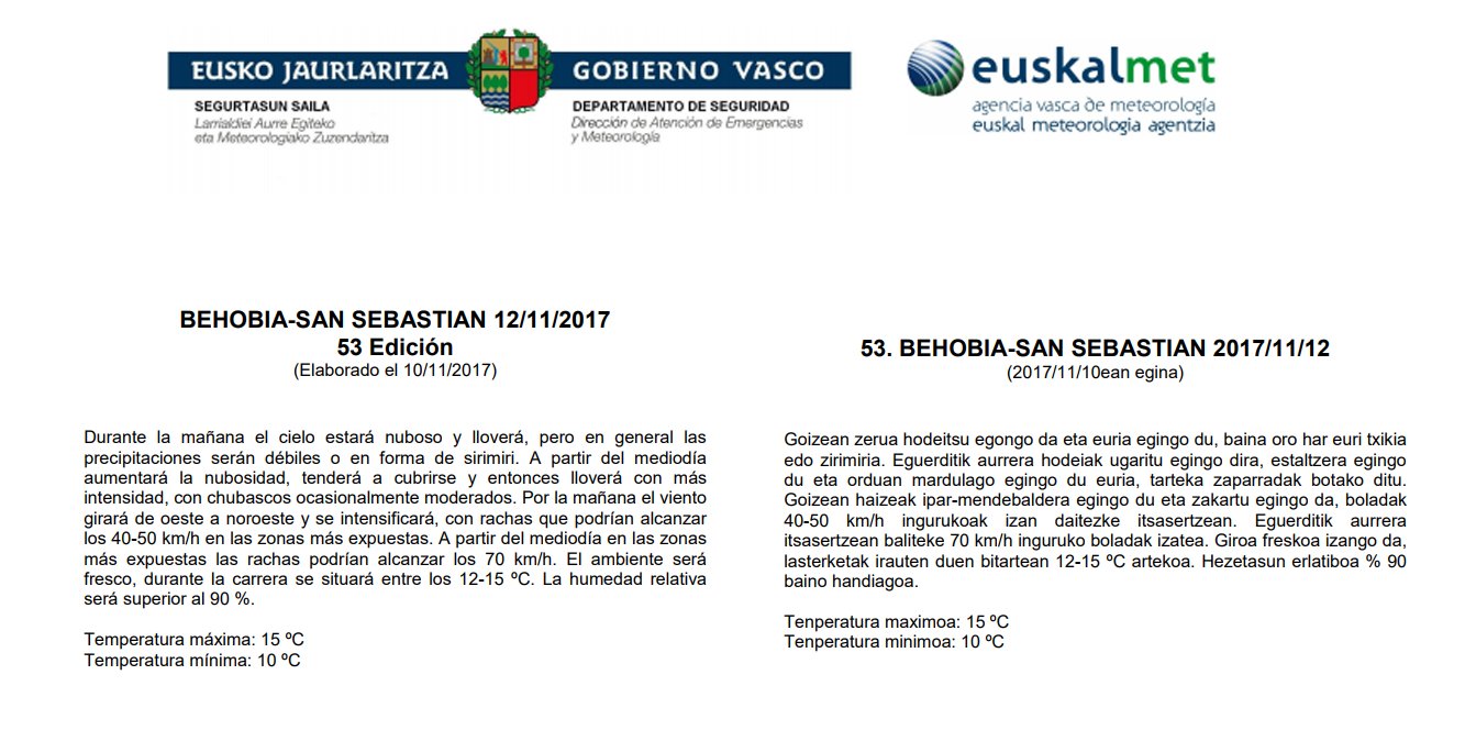 El tiempo no acompañará a los participantes de la 53ª edición de la Behobia-Donostia. Las previsiones meteorológicas para este domingo apuntan un día lluvioso, aunque lloverá menos durante las primeras horas del día, y con viento del oeste que soplará de forma moderada.