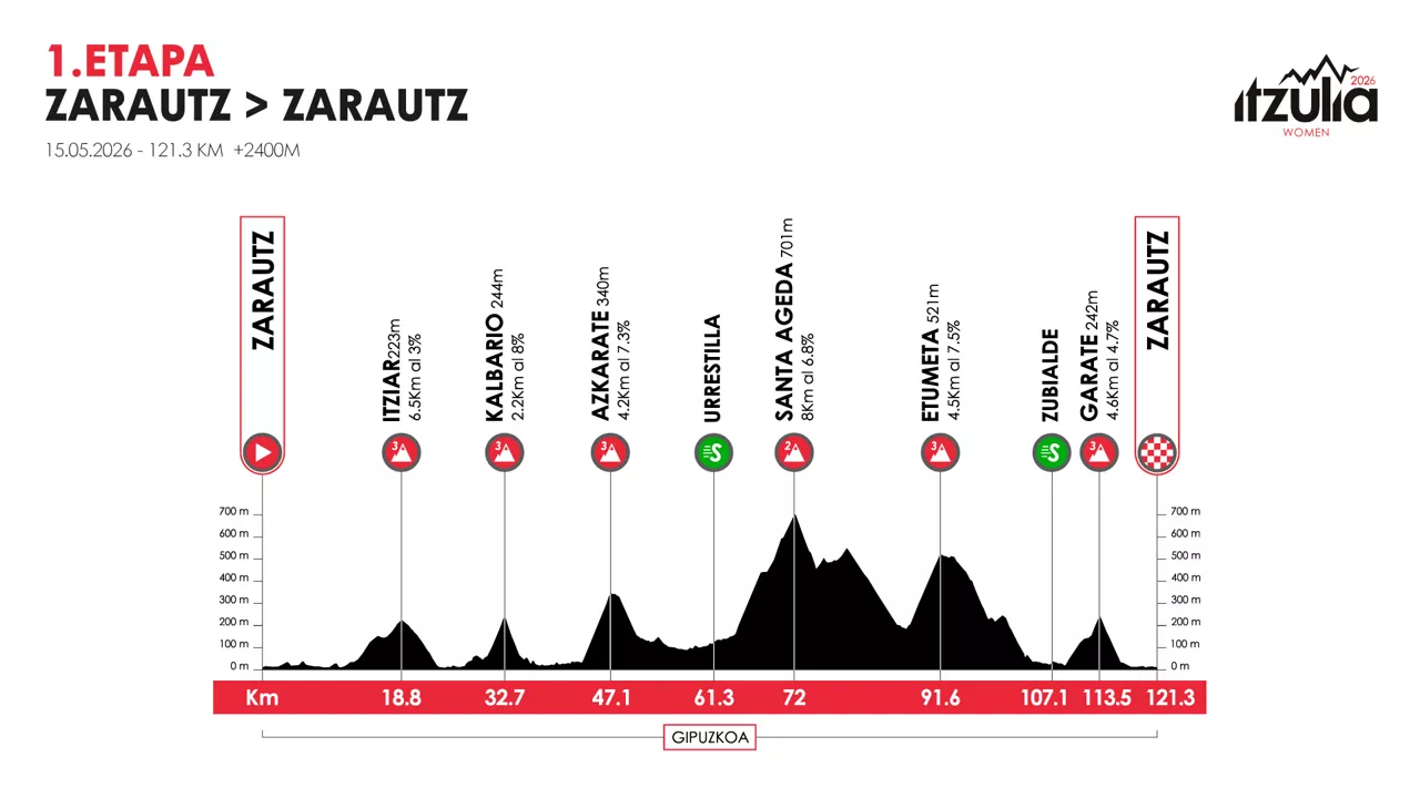 Así las cosas, la primera etapa de la Itzulia Women de 2026, el viernes 15 de mayo, saldrá de Zarautz, y concluirá en la misma localidad guipuzcoana, tras recorrer 121,3 kilómetros. Se trata de una jornada con un desnivel acumulado de 2400 metros, en la que las ciclistas deberán ascender hasta seis puertos puntuables para el Gran Premio de la Montaña. Las corredoras deberán ascender Itziar, de tercera categoría, con su pancarta en el kilómetro 18,8, y llegan luego Kalbario, de tercera, en el kilómetro 32,7, y Azkarate, de tercera, en el 47,1. Urrestilla será el lugar en el que las participantes de la Itzulia disputen el primer esprint especial de la quinta edición de la carrera, en el kilómetro 61,3, y espera a continuación Santa Ageda, de segunda, en el kilómetro 72. Etumeta, de tercera (kilómetro 91,6), precede al esprint especial de Zubialde (kilómetro 107,1), y Garate, de tercera categoría, con su pancarta a solo ocho kilómetros de la meta de Zarautz, es la última dificultad montañosa del primer día de competición.