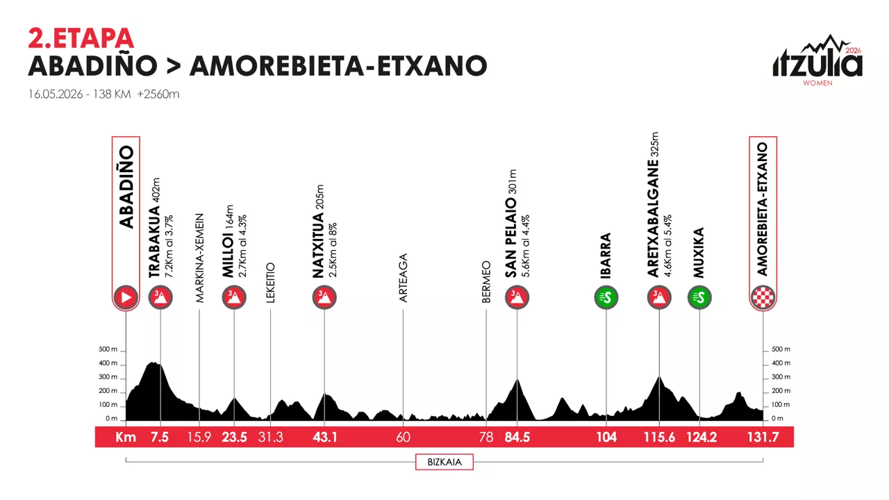 Al día siguiente, el sábado 16, la Itzulia estará en Bizkaia. Tras salir de Abadiño, las ciclistas subirán Trabakua, de tercera categoría, en el kilómetro 7,5 de etapa, antes de ascender Milloi, también de tercera, en el 23,5. Después de dejar atrás Lekeitio, las corredoras afrontarán la ascensión a Natxitua, de tercera (kilómetro 43,1), antes de que los y las aficionadas de Arteaga y Bermeo aplaudan a las participantes de la Itzulia.