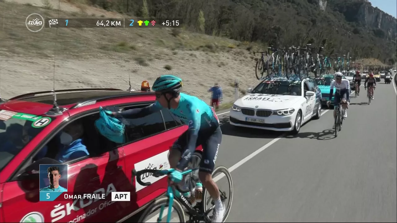 El ciclista vizcaíno del Astana está haciendo un gran inicio de la Itzulia. En las imágenes se le ve bajando al coche neutro para dejar ropa y la bolsa del avituallamiento.