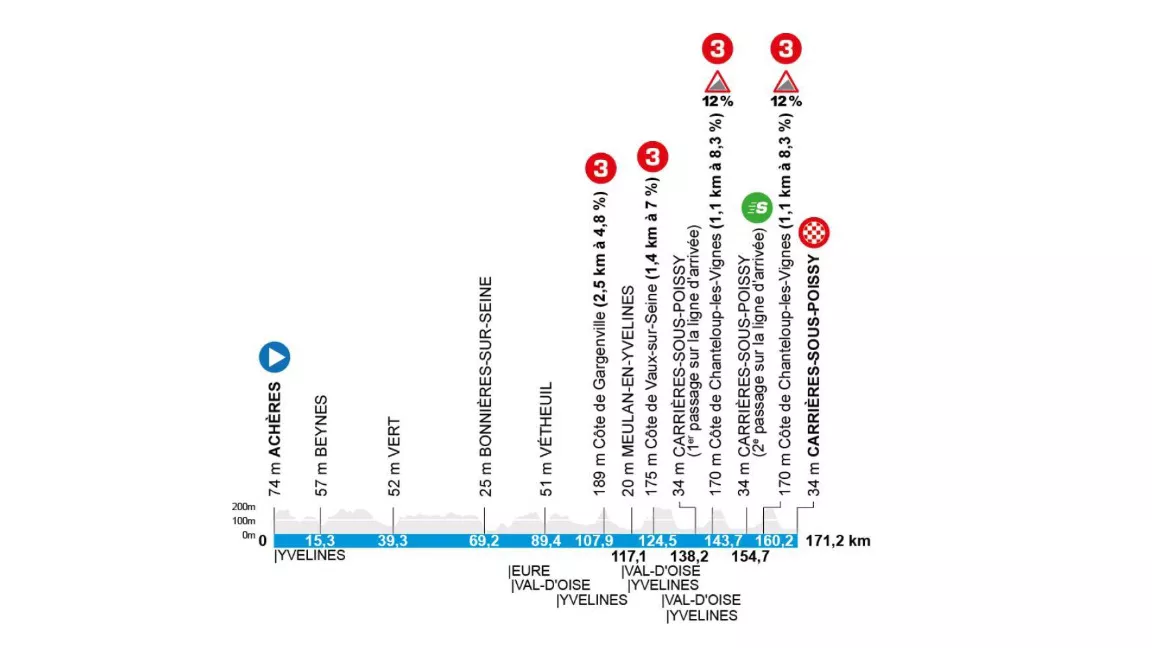 La primera etapa ya promete enfrentamientos, con un final en circuito alrededor de Carrières-sous-Poissy por la Côte de Chanteloup-les-Vignes, un ascenso emblemático de la Polymultipliée.