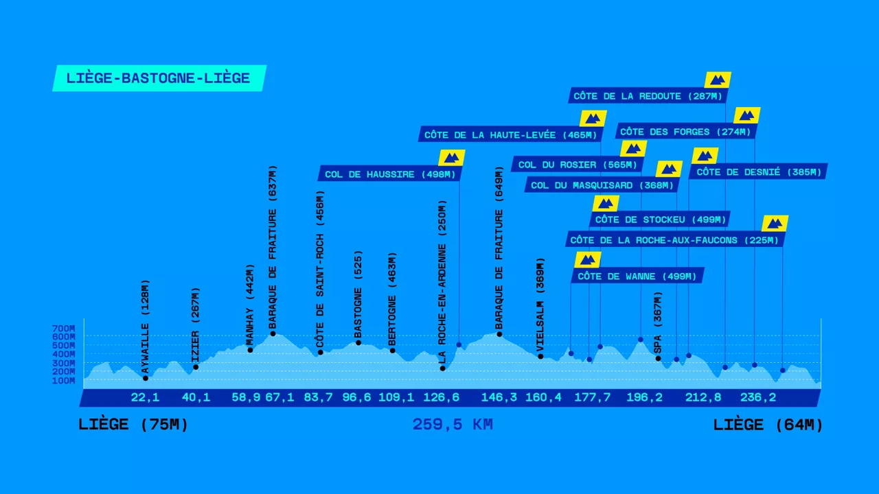 Así, el recorrido incluirá el Col du Maquisard y la Côte de Desnié, encadenados entre el Col du Rosier y La Redoute, uno de los puntos clave de la carrera. Tras ellos, el trazado mantendrá su dureza tradicional con el paso por la Côte des Forges y la ya decisiva Roche-aux-Faucons, última dificultad del día situada a 13 kilómetros de la línea de meta.