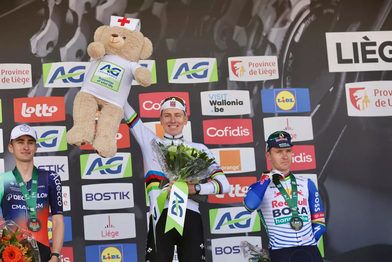 Remco Evenepoel (Red Bull). ha sido tercero tras protagonizar un inicio muy agresivo, aunque no ha podido seguir el ritmo impuesto por Pogacar en el momento decisivo. Con este triunfo, el esloveno ha igualado en el palmarés a Alejandro Valverde y Moreno Argentin, quedándose a una sola victoria del récord de Eddy Merckx.