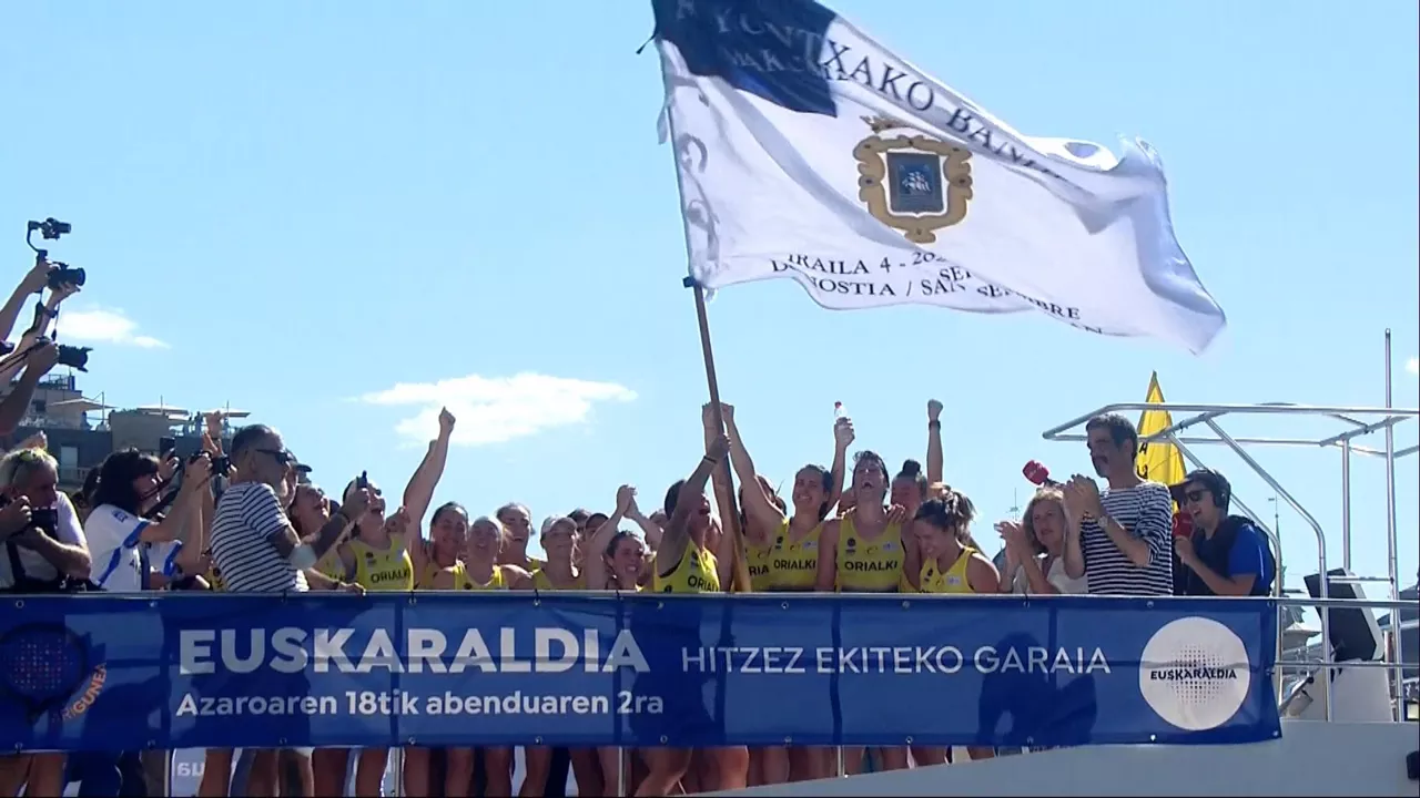 Antes, hemos podido ver a los remeros de Orio, bailando juntos, y al patrón, Gorka Aranberri, recibiendo un premio; con la entrega de la bandera, por parte del alcalde Eneko Goia, la alegría se ha desbordado entre los aguiluchos.