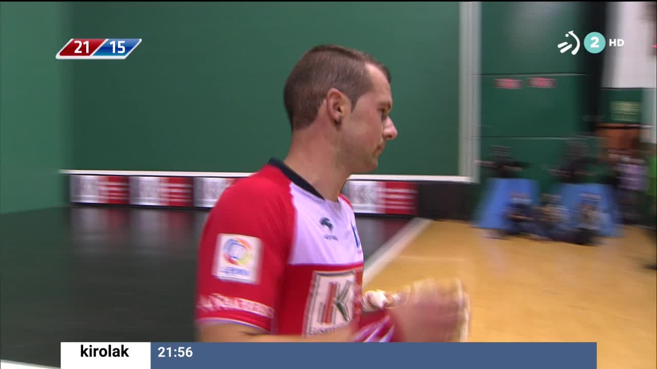 Aitor Elordi y Peio Etxeberria han disputado su tercer partido de la liguilla del Cuatro y Medio, ya sin nada en juego. En el mismo Elordi ha logrado su primera victoria de la liguilla ante el ya clasificado para semifinales Peio Etxeberria (22-15).