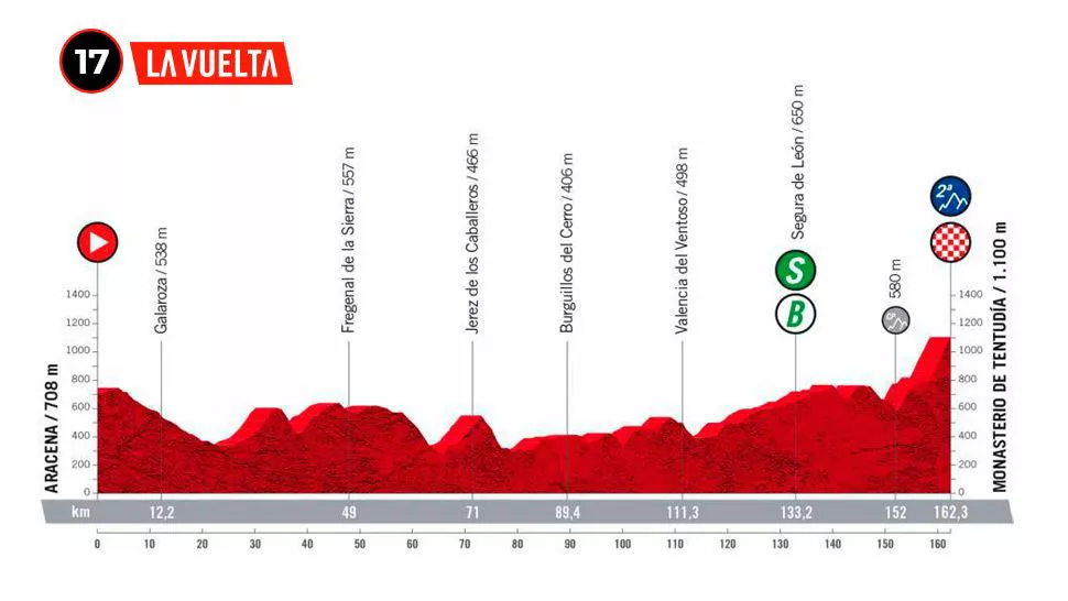 Recorrido y perfil de la etapa 17 de la Vuelta a España 2022: Aracena-Monasterio de Tentudía (162,3 km)