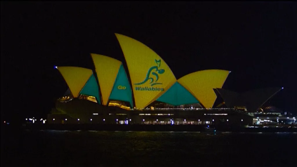 Australia y Nueva Zelanda se enfrentan en la final del Mundial de Rugby. La Ópera de Sídney muestra así el apoyo a su selección.