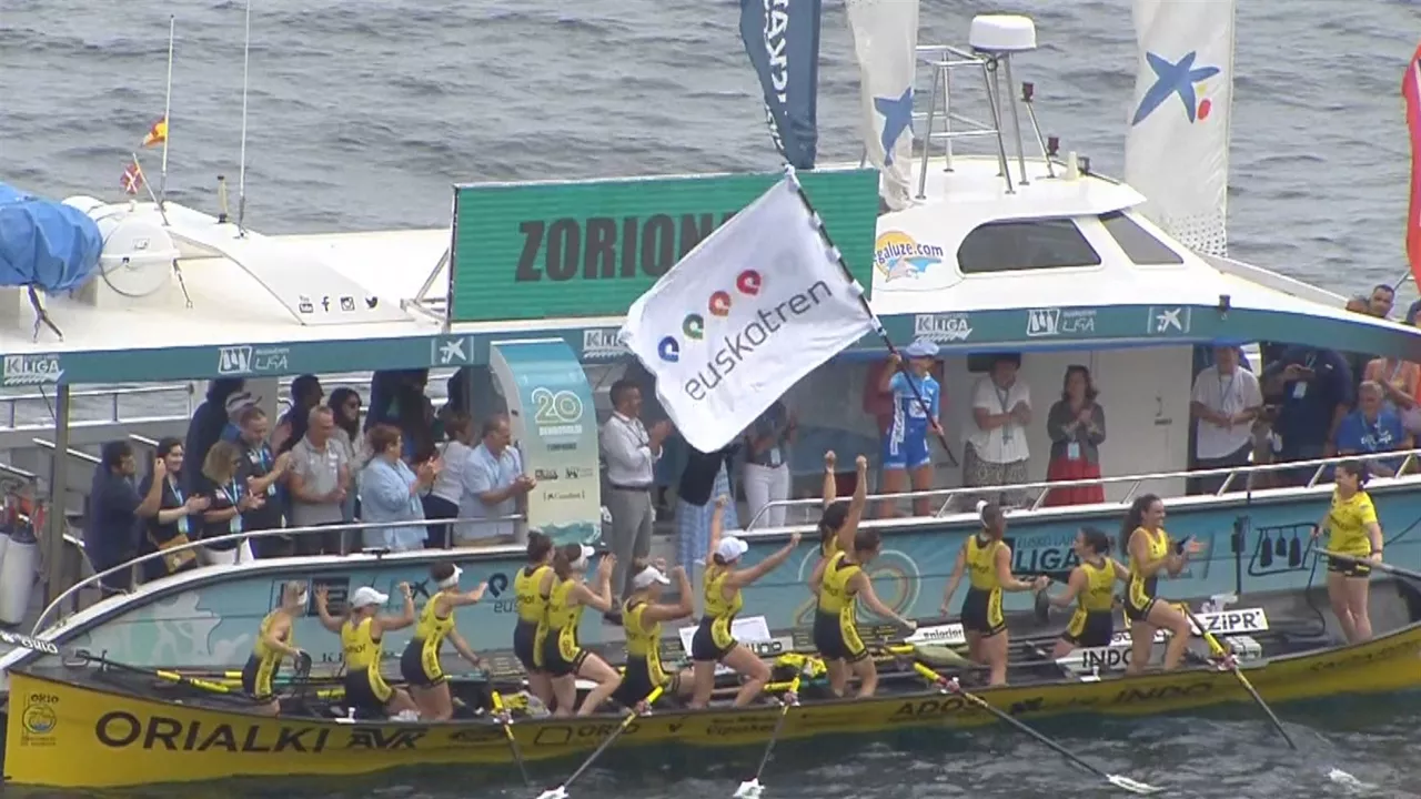 Denboraldiko zazpigarren bandera lortu dute oriotarrek, bigarren luzean erabaki den estropadan nagusitu eta gero. Euskotren Ligako sailkapenean bost puntura zabaldu dute Arraun Lagunakekiko errenta.