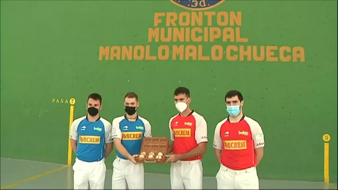 Tolosako Beotibar pilotalekuan jokatutako partidaren lehen erdia oso parekatua izan da, baina bigarrenean Unai Lasok eta Jon Ander Albisuk Iñaki Artola eta Ander Imaz aise menderatu dituzte.