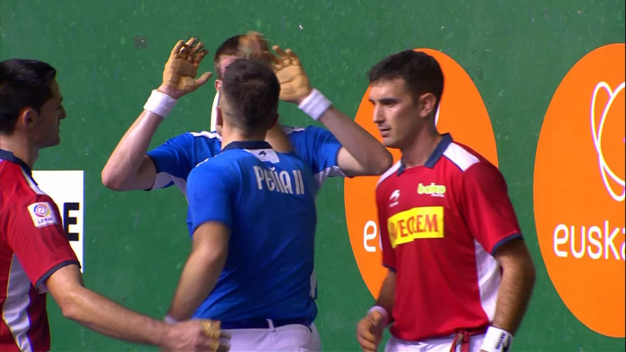 Jon Ander Peña eta Ruben Salaverri 21-18 ari ziren gailentzen, Amiano-Eskiroz aurkari; orduan, Peña II.ak hormara bota du pilota, eta, nahi gabe, Fuenmayorreko atzelaria jo du. Salaverri II.ak aldagelara joan behar izan du, baina, gerora, bueltatu da kantxara, eta partida amaitu du.