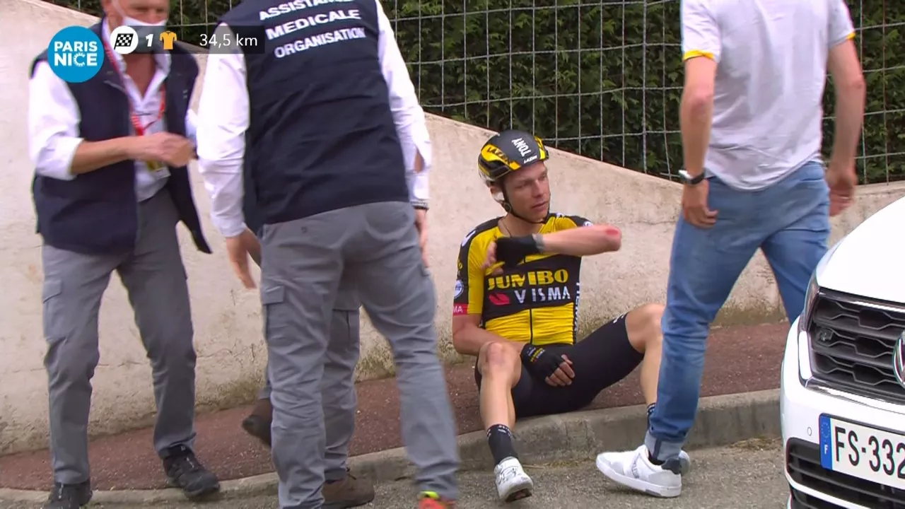 Jumbo Visma taldeko Tony Martin eta Primoz Roglic lurrera joan dira Paris-Nizako 5. etapan, helmugarako 34 kilometro falta zirenean. Martinek lasterketa utzi du, eta Roglicek jarraitu ahal izan du.