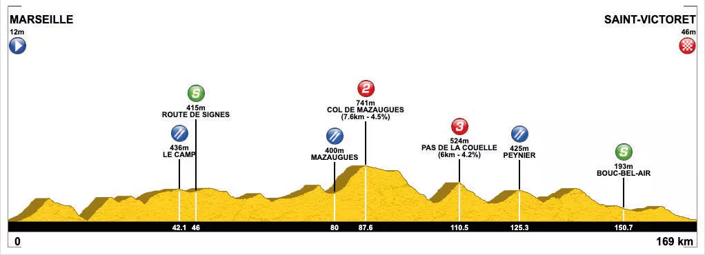 1. etapa : otsailak 13, ostirala. Marseilla – Saint-Victoret (168,82 km); irteera 11:45ean eta helmuga 14:00etan.